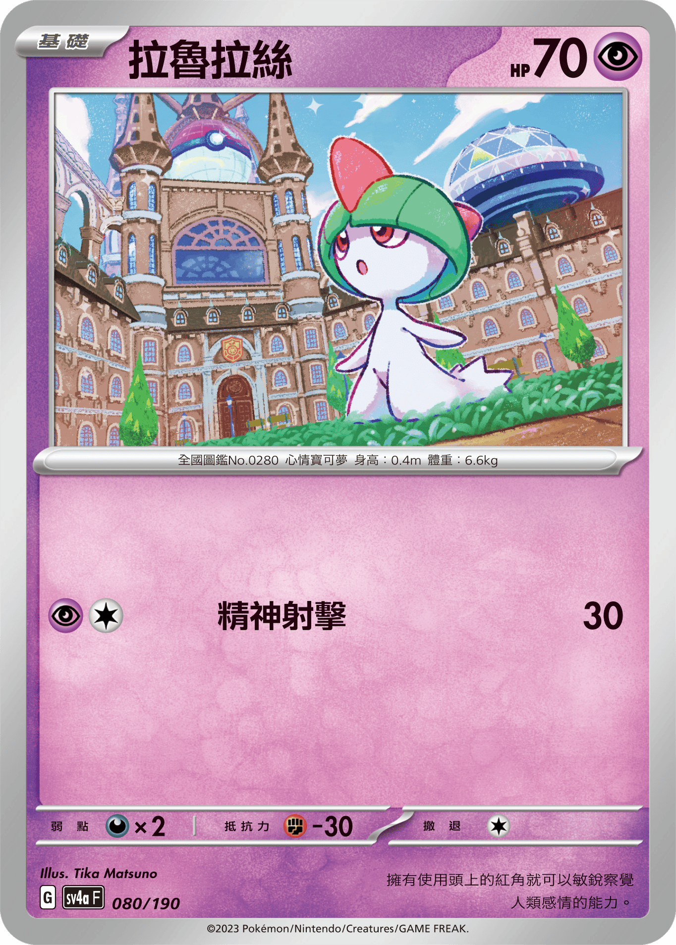 [特性]精神拥抱在自己的回合时,可不限次数使用。从自己的弃牌区选择1张「基本【超】能量」卡,附于自己的【超】宝可梦身上。然后,在附上那张卡的宝可梦身上放置2个伤害指示物。(这个特性无法对会【昏厥】的宝可梦使用。)